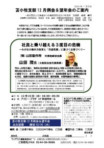 バブル崩壊、リーマンショックを乗り越えてきた山田製作所が、コロナ禍をどう乗り越えようとしているのか。その経営実践から、経営者の覚悟と変化すべきことは何かを、激動の2020年最後の例会として学び合って参ります。終了後は20 […]